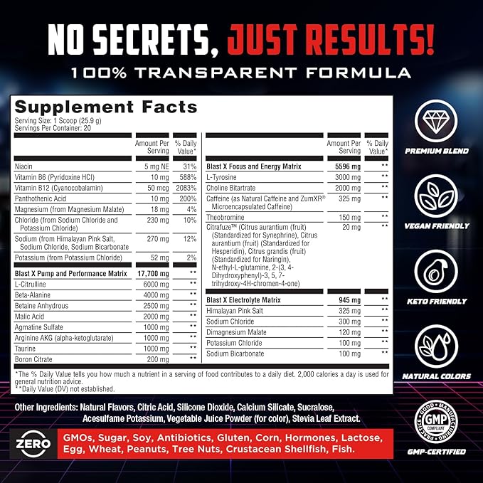 - Elevate Your Performance – Discover a pre-workout designed to enhance your fitness journey. Blast X features a scientifically crafted formula that combines premium ingredients such as natural caffeine, ZumXR, Citrafuze, L-Tyrosine, L-Citrulline, Beta-Alanine, Taurine, and a complete 925mg Electrolyte Matrix. This advanced blend supports sustained energy, focus, hydration, and endurance to help you maximize every workout.