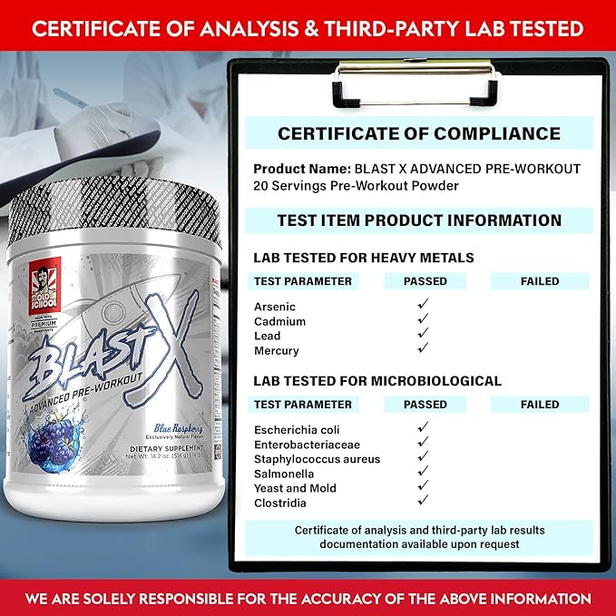 - All-In-One Workout Supplement - Blast X is your ultimate pre-workout solution, expertly crafted with potent stimulants, focus enhancers, and N.O. compounds to supercharge your training. With 20 clinically dosed servings per container, it's perfect for high-intensity cardio sessions, delivering sustained energy and razor-sharp focus for hours.