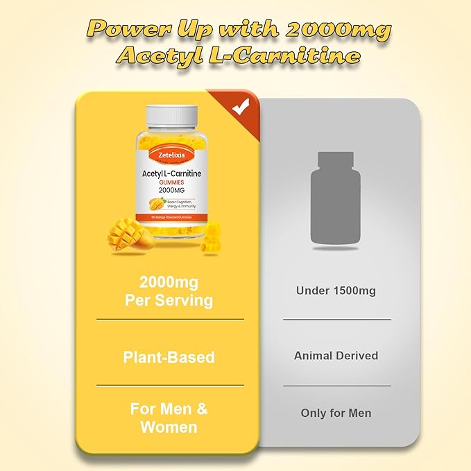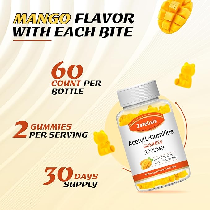 - A Burst of Mango Flavor in Every Chew: Each bottle contains acetyl l carnitine 2000mg gummies, enough for 30 days. Zetelixia's unique mango flavor gives you a fresh, sweet, and sour taste. Whether enjoyed by yourself or shared with friends, this mango-flavored acetyl l-carnitine gummy is an indispensable companion in your daily life