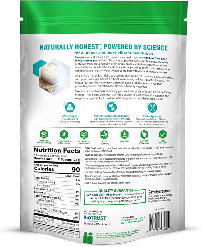 BioTrust Low Carb Lite, Low Calorie Protein Powder – Low Carb, Sugar Free, Low Sodium, Keto Protein Powder – 20g Grass-Fed Whey Protein Isolate with Digestive Enzymes – Unflavored, 14 Servings
