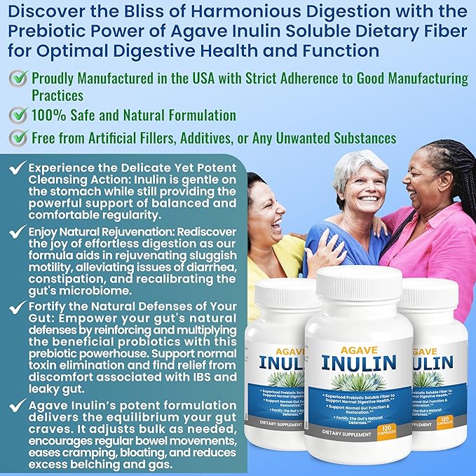 - Inulin Prebiotic Fiber: Harvested from agave, our inulin capsules are packed with beneficial inulin fiber renowned for its prebiotic properties. Rich in prebiotics, inulin supports the natural probiotics in your gut, addressing digestive issues such as leaky gut, IBS, irregularity, and constipation. Potent yet gentle, it achieves desired results without causing unwanted side effects like bloating or excessive gas.