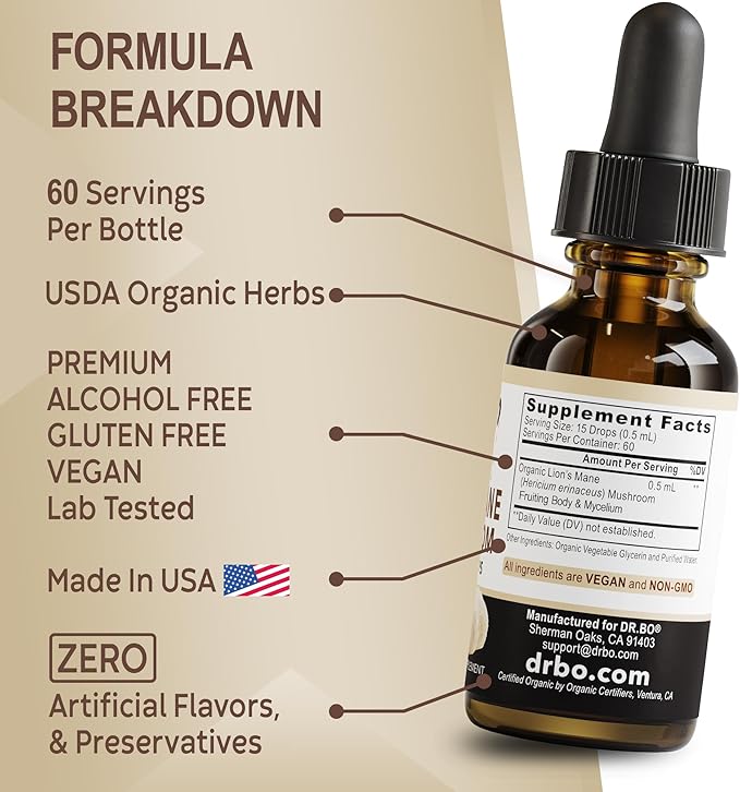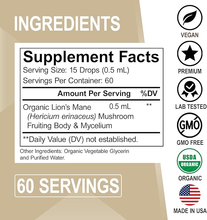 - Premium Organic: Our organic lions mane mushroom supplement drops are made with pure organic hericium erinaceus extract; best choice lion's mane mushroom drops to support adults, kids, women & men