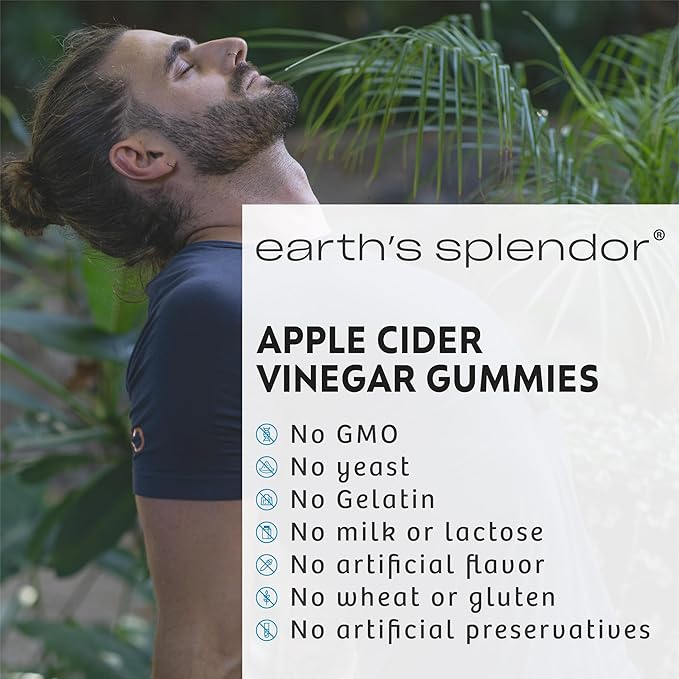 - Premium Quality Ingredients: Earth's Splendor Apple Cider Vinegar Gummies are made with high-quality apple cider vinegar, sourced from the finest apples to ensure maximum potency and effectiveness. Our gummies are non-GMO, gluten-free, and vegan, catering to a variety of dietary preferences and needs.