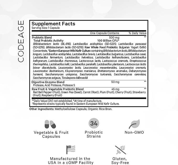 - Comprehensive Probiotic Blend: Codeage Raw Probiotic supplement provides a potent mix of 34 diverse probiotic strains, including Bifidobacterium lactis (BL-818), Lactobacillus acidophilus (SD-5221), and Lactobacillus paracasei (SD-5218), delivering 100 billion CFUs** per serving.