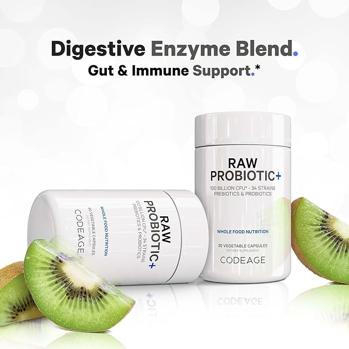 Codeage Raw Probiotic+ Supplement - 34 Probiotic Strains, 100 Billion CFUs, Raw Whole Food Probiotics, Digestive Enzymes, Raw Fruits & Veggies Prebiotics - Wild Kefir Culture - Non-GMO - 30 Capsules