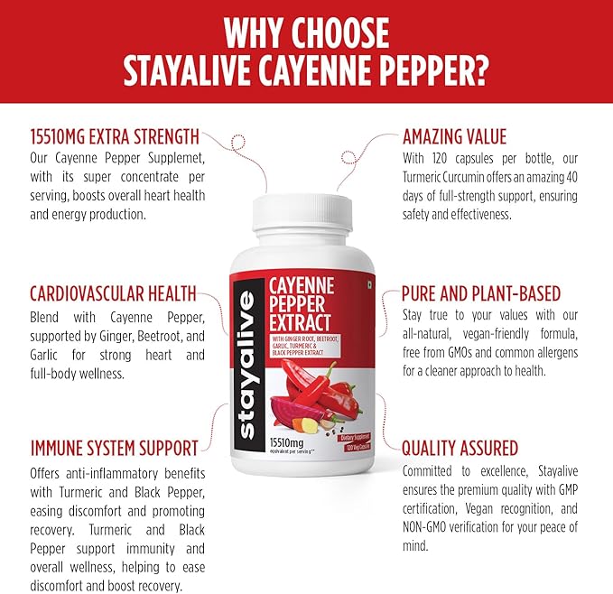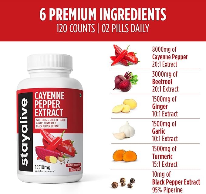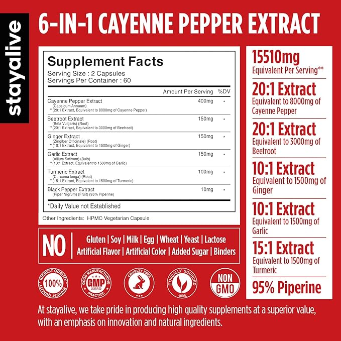 Stay Alive Cayenne Pepper 8000mg, Ginger 1500mg, Garlic 1500mg, Turmeric 1500mg, BeetRoot 3000mg, Black Pepper, 120 Cayenne Capsules, Support Cardiovascular & Immune System, Capsaicin Supplement Pills