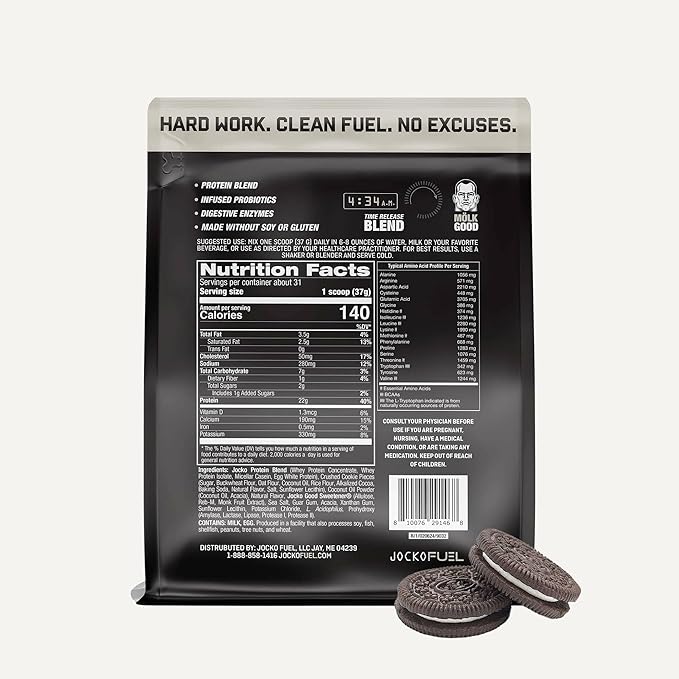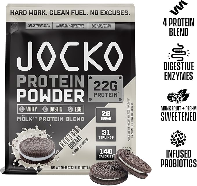 Jocko Mölk Whey Protein Powder - Keto, Probiotics, Grass Fed, Digestive Enzymes, Amino Acids, Sugar Free Monk Fruit Blend - Supports Muscle Recovery & Growth (2 LB, Cookies & Cream)