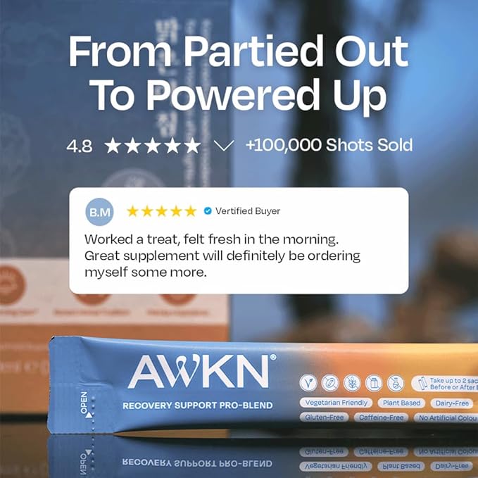 - BEFORE AND AFTER CARE: Take one AWKN shot before your first drink and another before bed to support your body when it needs it most. The ultimate sidekick for unforgettable nights and better mornings.