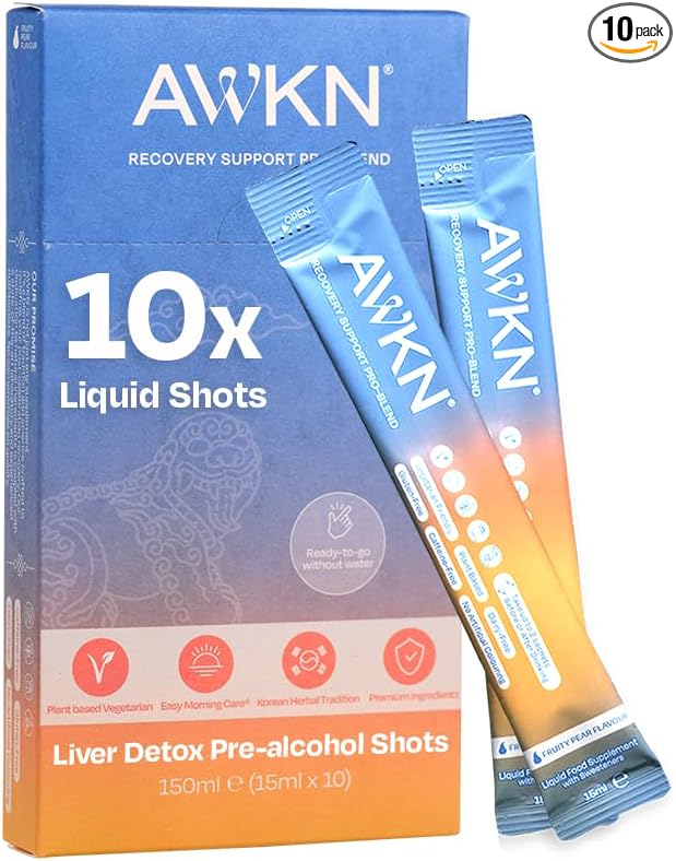 - PRE-SLEEP RECOVERY SHOT: AWKN combines the wisdom of Korean traditional herbs like Red Ginseng, Korean Pear, and Curcumin with modern recovery essentials, delivering a potent pre-drinking shot designed for optimal liver support and hydration.