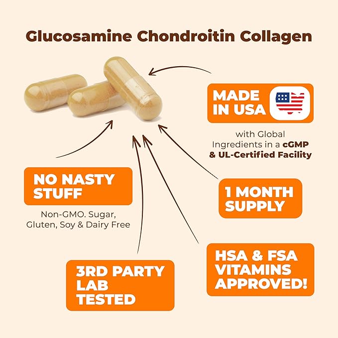 - CHONDROITIN & GLUCOSAMINE NUTRITIONAL SUPPLEMENTS YOU CAN TRUST. Made in the USA in a cGMP-Certified & UL-Certified Facility. Globally-Sourced ingredients. Non-GMO. HSA & FSA Vitamins Approved. Free from Gluten, Dairy, Sugar, and Soy. A convenient flip-top bottle.