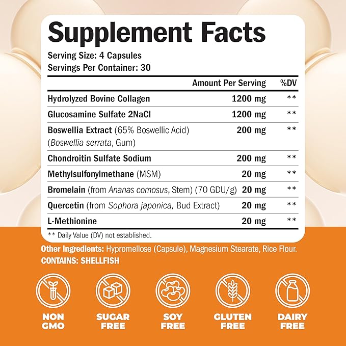 - Primary Supplement Type : Glucosamine, Collagen, Chondroitin, Boswellia, Bromelain, Quercetin, MSM