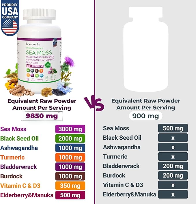 - HEALTH BENEFITS: Our Sea Moss capsules, Black Seed Cumin and Ashwangha Supplements formulas are proudly made to create trusted seamoss and bladderwrack capsules, black seed cumin oil, ashwagandha for men and bladderwrack supplement.