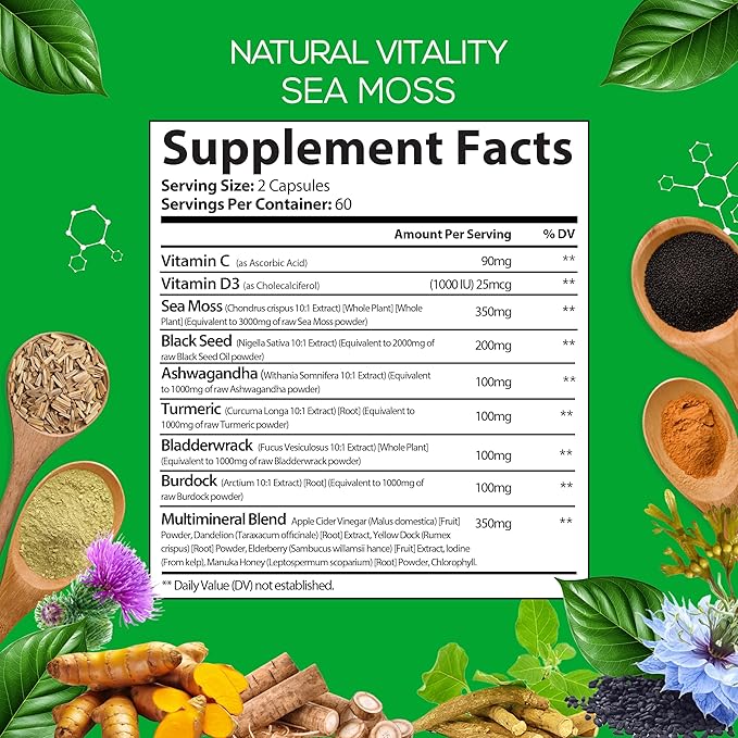 - ALL in 1 MAGIC INGREDIENTS: Sea Moss, Black Seed Oil, Ashwagandha, Turmeric, Bladderwrack, Burdock, Vitamin C, Vitamin D3 with Elderberry, Dandelion, Yellow Dock, Iodine, Manuka Honey, Chlorophyll and Apple Cider Vinegar (ACV) all have various health benefits.