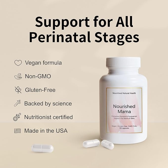 - PRENATAL, IN-UTERO & POSTPARTUM SUPPORT - Nourished Mama is a meticulously formulated vegan vitamin supplement designed for all perinatal stages from preconception to postpartum. 3 capsules a day can help prepare your body for conception and pregnancy, replenishing your nutrient stores and enhancing egg quality and ovulation. It supports baby's growth during pregnancy, nourishes mama during recovery, and even supports breastfeeding and lactation for those who choose to.