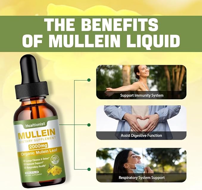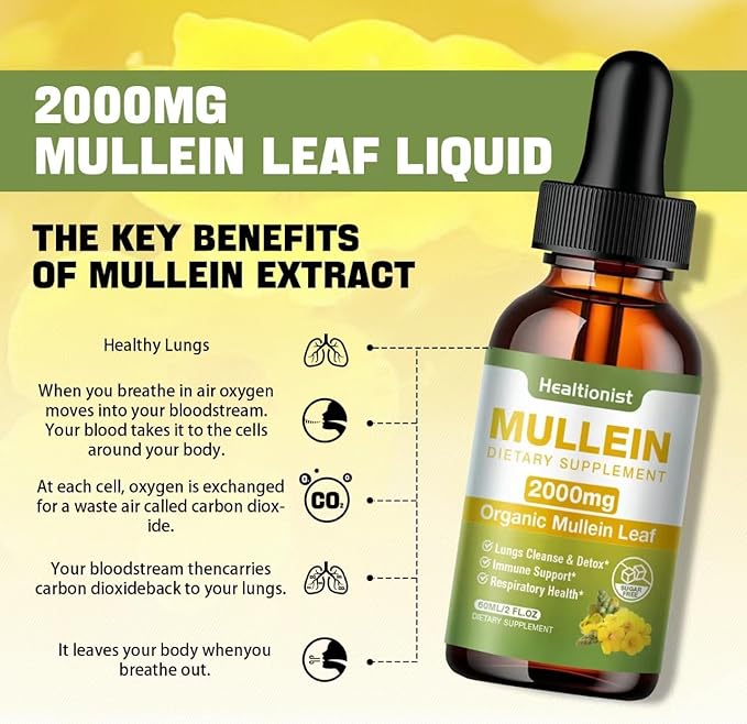- Advanced Formulation: Healtionist mullein liquid drops containing 2000mg organic mullein leaf. Healtionist advanced tincture formula absorbed faster by the body compared to capsules, potentially offering quicker absorption of all the benefits of Mullein Leaf Extract. You can incorporate them into your daily routine without feeling guilty or affecting your dietary preferences.