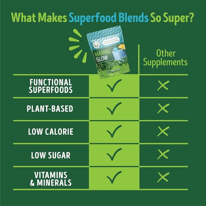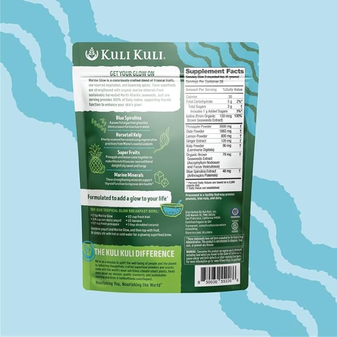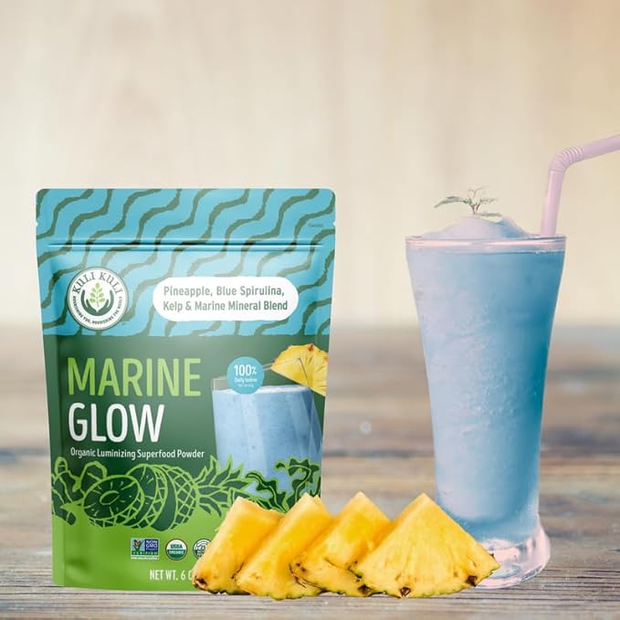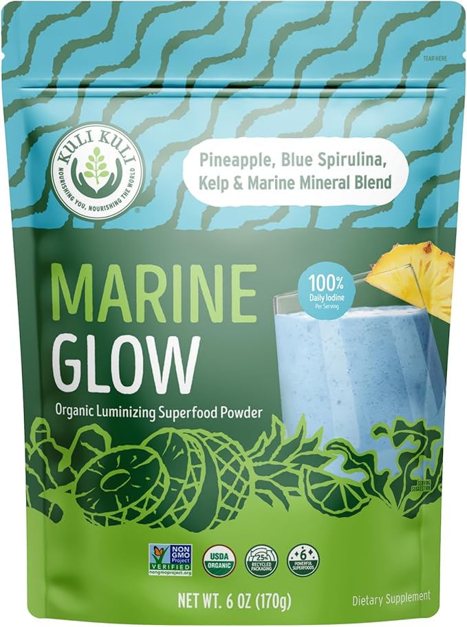 - SUPPORTS SKIN HEALTH AND BEAUTY - Kuli Kuli Marine Glow Blend Superfood Powder is formulated to enhance skin health with powerful marine minerals and superfruits. This blend includes Blue Spirulina, Horsetail Kelp, Pineapple, and Lemon, which work together to promote a natural glow.