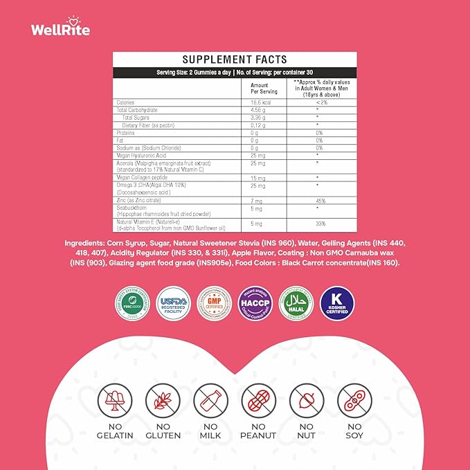 - Primary Supplement Type : Vegan Hyaluronic Acid, Acerola, Vegan Collagen Peptide, Omega 3, Zinc, Seabuckthorn, Natural Vitamin E Vegan Hyaluronic Acid, Acerola, Vegan Collagen Peptide, Omega 3, Zinc, Seabuckthorn, Natural Vitamin E