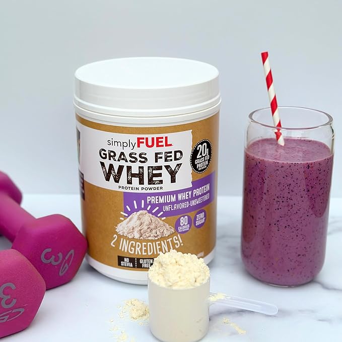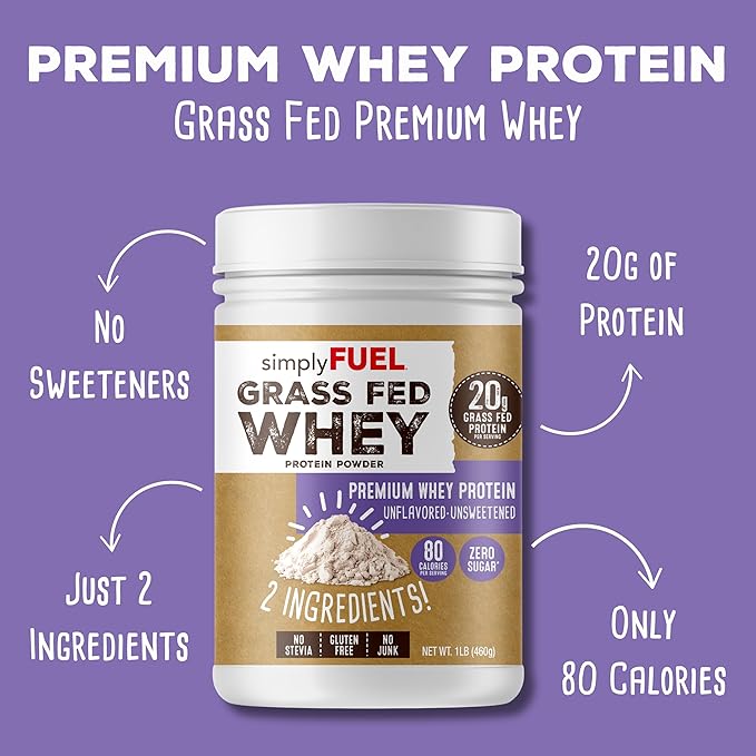 - ONLY 2 INGREDIENTS: 100% Grass Fed Premium Whey Protein Isolate + sunflower lecithin. simplyFUEL Whey has nothing artificial ingredients. No artificial sweeteners, no artificial flavors, no stevia, no soy, and gluten free