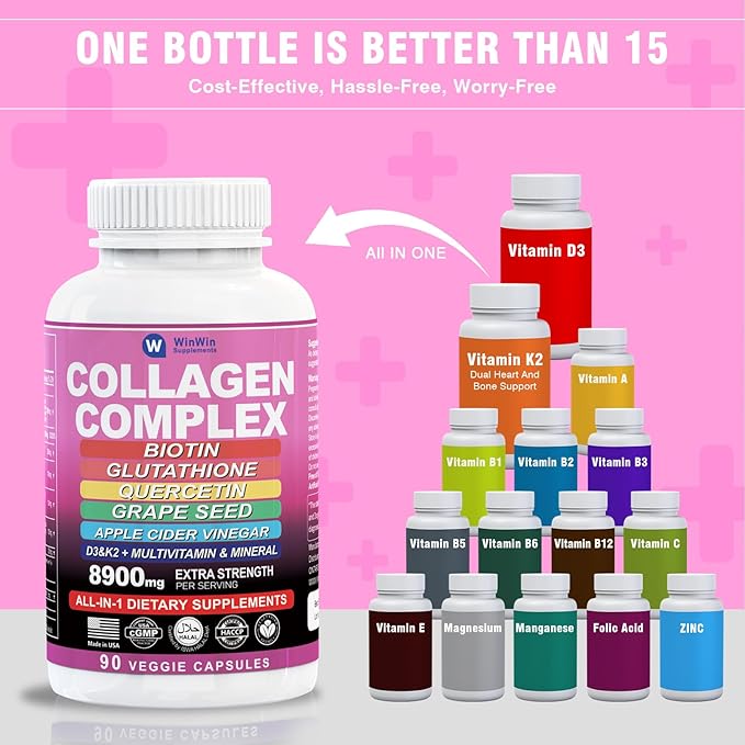 Collagen1000mg Type I, II, III, V, X Multi- Organic Quercetin Grape Seed, Apple Cider Vinegar Botanical Supplement with Biotin Glutathione Multi-Vitamins and Minerals Vitamin 29in1 Made in USA