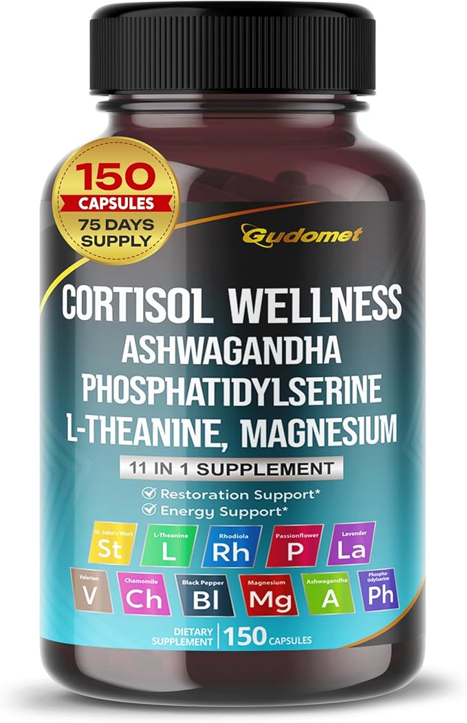 CORTISOL WELLNESS Magnesium Ashwagandha L-Theanine Phosphatidylserine Rhodiola Rosea Passionflower Lavender Chamomile -150 Capsules- Made in USA