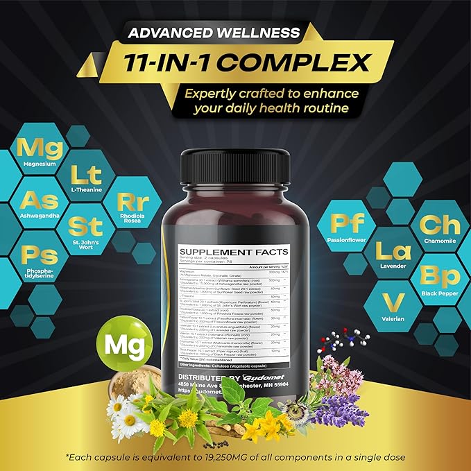 - 100% Pure & Natural Ingredients: Magnesium, Ashwagandha, Phosphatidylserine, L-Theanine, St. John's Wort, Rhodiola, Passionflower, Lavender, Valerian, Chamomile, and Black Pepper.