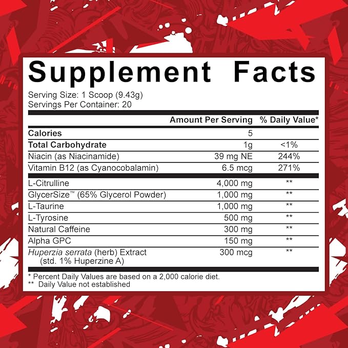 - JUMPSTART YOUR WORKOUT with an expertly balanced pre-workout! Featuring 300 mg of natural caffeine for a steady rush of energy,With L-Citrulline and GlycerSize for nitric oxide production and pump, plus brain-boosting ingredients for mental focus, it's the comprehensive pre-workout your training demands.