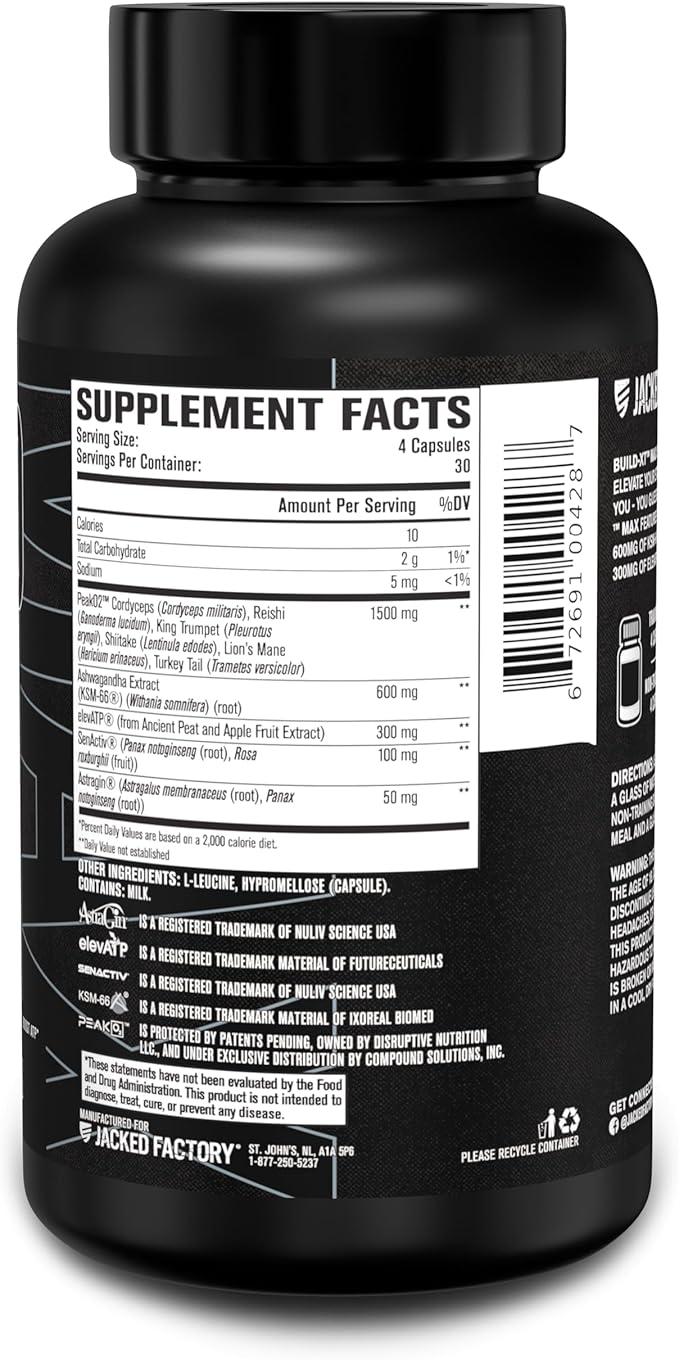 Jacked Factory Build-XT Max Muscle Builder for Men and Women - ATP Supplement with Peak02 Cordyceps, KSM-66 Ashwagandha, & ElevATP for Muscle Recovery, Muscle Growth, Increased Endurance - 120 Count