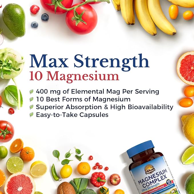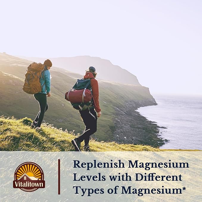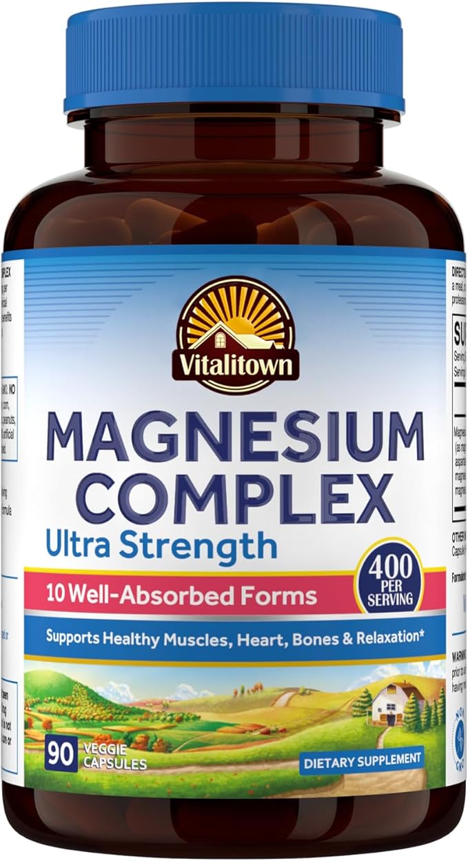 - 10-In-1 Magnesium Supplement: Vitalitown Ultra Strength Magnesium Complex Supplement contains 400 mg of elemental Mag per serving from ten of the most beneficial forms: magnesium glycinate, malate, gluconate, taurate, lactate, citrate, aspartate, succinate, oxide, and orotate.* They are specially selected for both men and women with unsurpassed bioavailability & quality.
