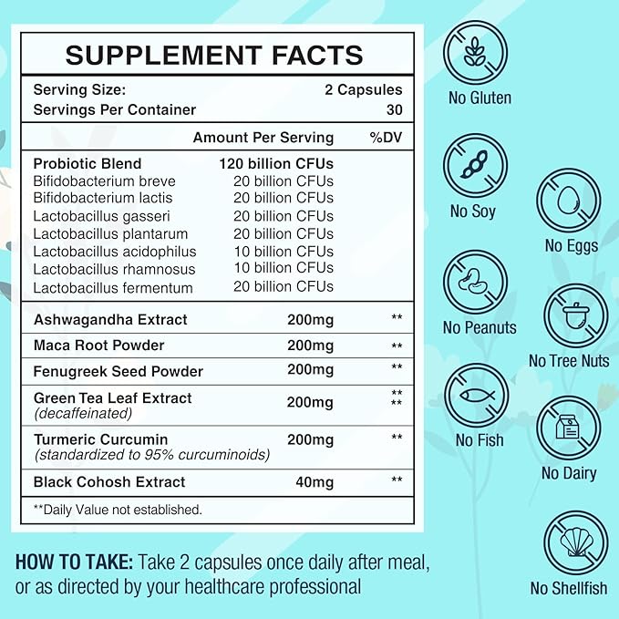 - Premium Organic Formula: Our 120 billion cfu menopause supplements for women feature a unique blend of high-quality organic ingredients, contains 7 probiotics strains, black cohosh extract, ashwagandha extract, maca root powder, fenugreek seed powder, green tea leaf extract, turmeric curcumin. 13-in-1 work synergistically to naturally womens menopause relief and the lasting digestive relief, to provide women with exceptional health benefits
