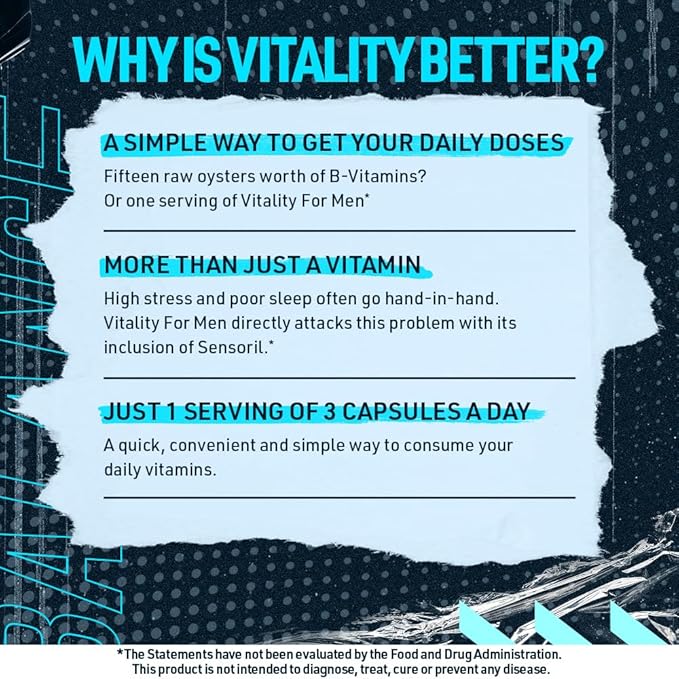 - ESSENTIAL VITAMINS - Essential vitamins cannot be produced by your body alone - you must consume them. VITALITY FOR MEN contains science-backed essential vitamins so you can get on with your day with confidence.
