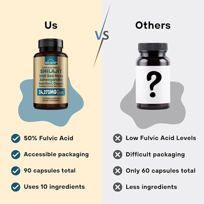 - EASY-TO-TAKE CAPSULES — Solnuvi's potent Himalayan Shilajit , Irish Sea Moss, Ashwagandha, Beet Root, Vitamin C, and Minerals all in one supplement contains an equivalent total of 24,273mg per serving of 3 small capsules. Our capsules are not only so easy to swallow, but also vegan friendly! They are convenient to take on the go or to incorporate into your everyday life as a part of your normal daily health routine. With simply 3 capsules each day, you can take your wellness to the next level!*