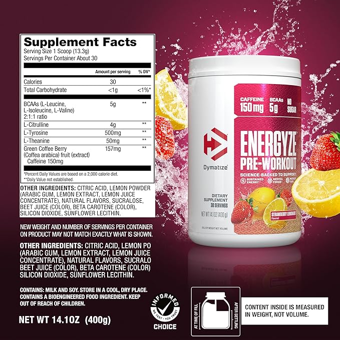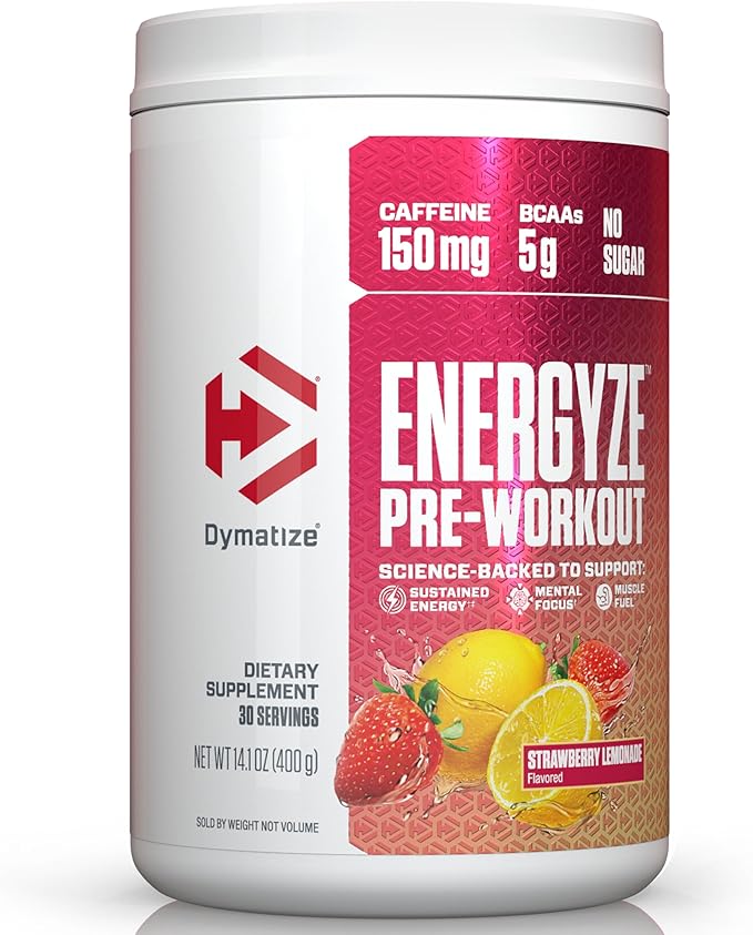 Dymatize Energyze Pre Workout Powder for Men and Women, Strawberry Lemonade Flavor, 150mg Caffeine, 5g BCAAs, Performance Blend of L-Theanine, L-Tyrosine, L-Citrulline, No Sugar, 30 Servings