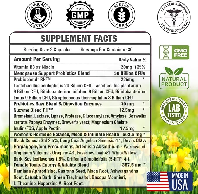 - 【 21 PREMIUM INGREDIENTS 】: Black Cohosh, Dong Quai, Devils Claw, Artemisia, Oregano, Feverfew, White Willow, Soy Isoflavones, Griffonia 5-HTP + Damiana Aphrodisiac, Guarana, Maca Root, Ashwagandha, Catuaba Bark, Green Tea Leaf, Inositol, Bacopa Monnieri, L-Theanine, Huperzine-A, Turmeric + 5 Strains of Probiotics & Prebiotics.