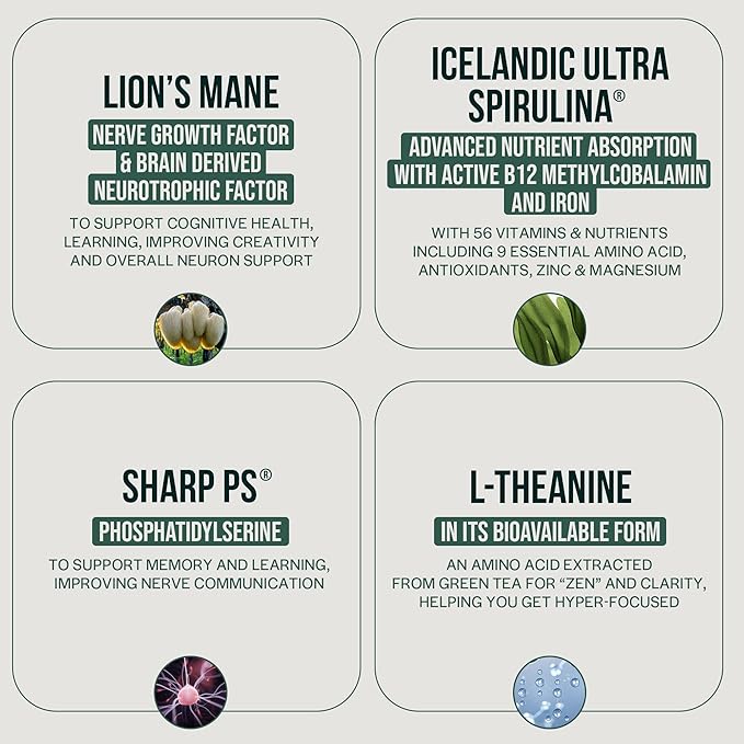 - NOOTROPIC SUPPORT SUPPLEMENT: We combine Icelandic Ultra Spirulina with clinically tested ingredients like SHARP-PS Phosphatidylserine, L-Theanine, Lion’s Mane Mushroom, and Vitamin B6, to support mental performance. Additionally, it aids in recovering from occasional fatigue and low energy.