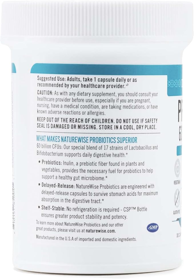 - PREMIUM INGREDIENTS: NatureWise 60 Billion CFU Probiotics are manufactured in the USA with high-quality ingredients from around the world in a cGMP-certified facility with third-party quality control audits.