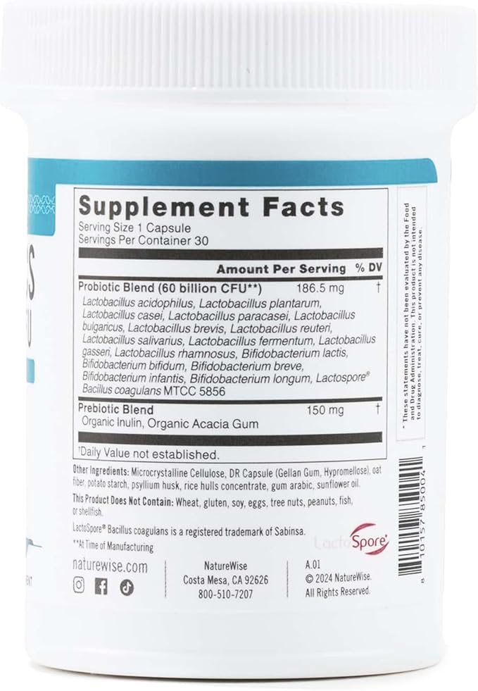 NatureWise Probiotics 60 Billion CFU - 17 Strains + Organic Prebiotics - Immune, Digestive & Gut Health Support for Women & Men - Vegetarian, Gluten-Free, Non-GMO - 30 Capsules[1-Month Supply]