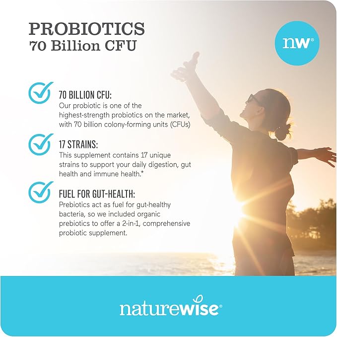 NatureWise Probiotics 70 Billion CFU - 17 Strains + Organic Prebiotics - Immune, Digestive & Gut Health Support for Women & Men - Vegetarian, Gluten-Free, Non-GMO - 30 Capsules[1-Month Supply]