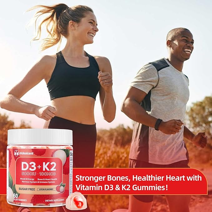 - 30 Days of Lychee-Flavored Wellness in Every Bottle! : Indulge in the unique taste of our lychee-flavored, center-filled gummies. Each D3 K2 vitamin gummy has a delightful, soft exterior with a burst of flavor in the middle. With 60 gummies per bottle, you get a 30-day supply when taking two gummies daily. This convenient dosage ensures you receive essential nutrients consistently, supporting bone health and overall wellness with every delightful bite
