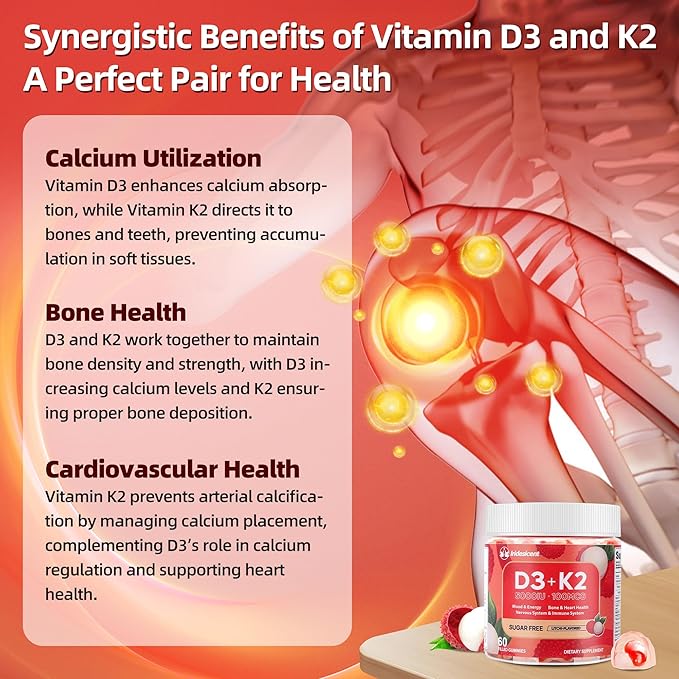 - Strengthen Your Bones with Every Filled Gummy! : Our vitamin D3 K2 gummies feature a unique liquid-filled design ensures that each gummy offers ultra-high absorption rates, making it more effective at delivering essential nutrients to your body. Infused with 125 mcg of Vitamin D3 (from Cholecalciferol) and 100 mcg of Vitamin K2 (from MK-7), supporting bone and cardiovascular health. D3 boosts calcium absorption, while K2 directs calcium to your bones, minimizing arterial calcification