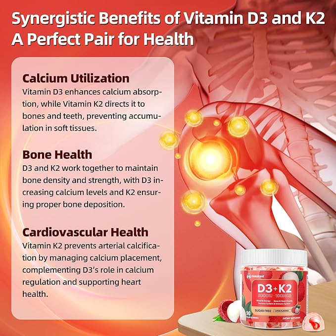 - Strengthen Your Bones with Every Filled Gummy! : Our vitamin D3 K2 gummies feature a unique liquid-filled design ensures that each gummy offers ultra-high absorption rates, making it more effective at delivering essential nutrients to your body. Infused with 125 mcg of Vitamin D3 (from Cholecalciferol) and 100 mcg of Vitamin K2 (from MK-7), supporting bone and cardiovascular health. D3 boosts calcium absorption, while K2 directs calcium to your bones, minimizing arterial calcification