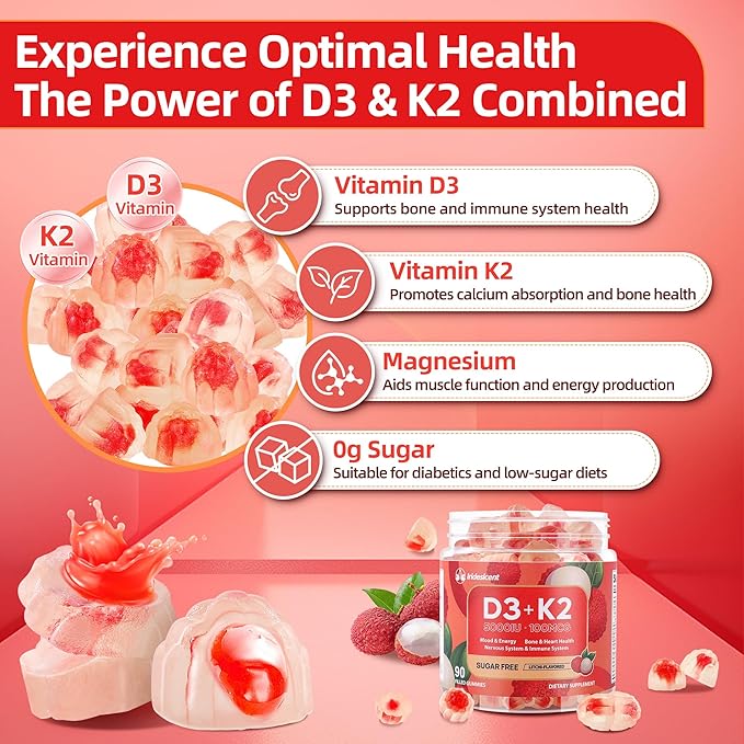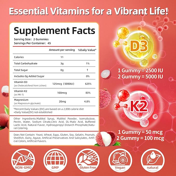 - 45 Days of Lychee-Flavored Wellness in Every Bottle! : Indulge in the unique taste of our lychee-flavored, center-filled gummies. Each D3 K2 vitamin gummy has a delightful, soft exterior with a burst of flavor in the middle. With 90 gummies per bottle, you get a 45-day supply when taking two gummies daily. This convenient dosage ensures you receive essential nutrients consistently, supporting bone health and overall wellness with every delightful bite