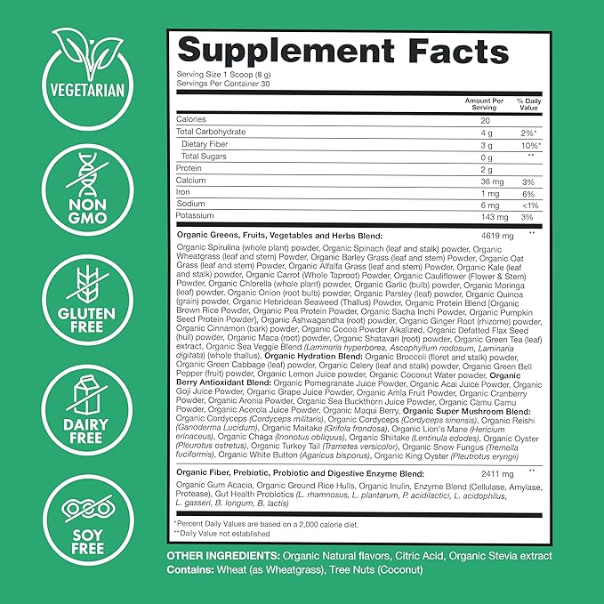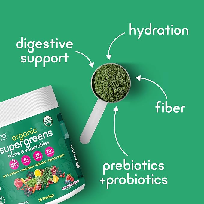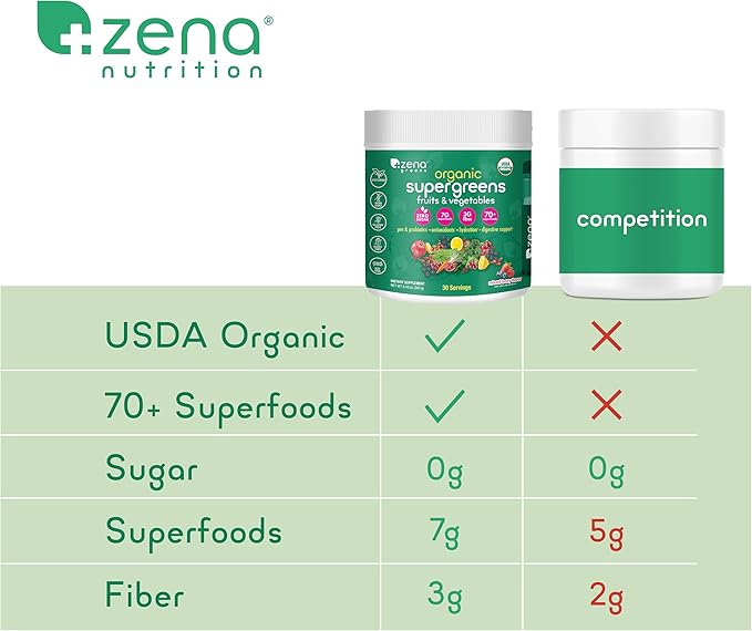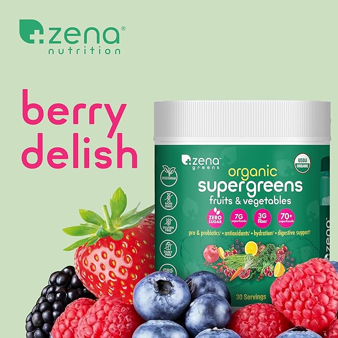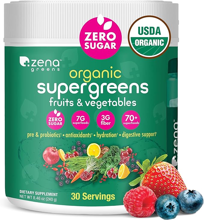 - ORGANIC SUPERGREEN BLEND: Enjoy a powerful boost of nutrition with Zena Greens Organic Super Greens Fruits & Vegetables. Each serving contains 7 grams of superfoods and 3 grams of fiber, featuring over 70+ super ingredients to support overall health and wellness. Packed with an extensive blend of organic greens, fruits, vegetables, herbs, super mushrooms, and essential prebiotics & probiotics with digestive enzymes, this supplement is designed to support your overall wellness and vitality.
