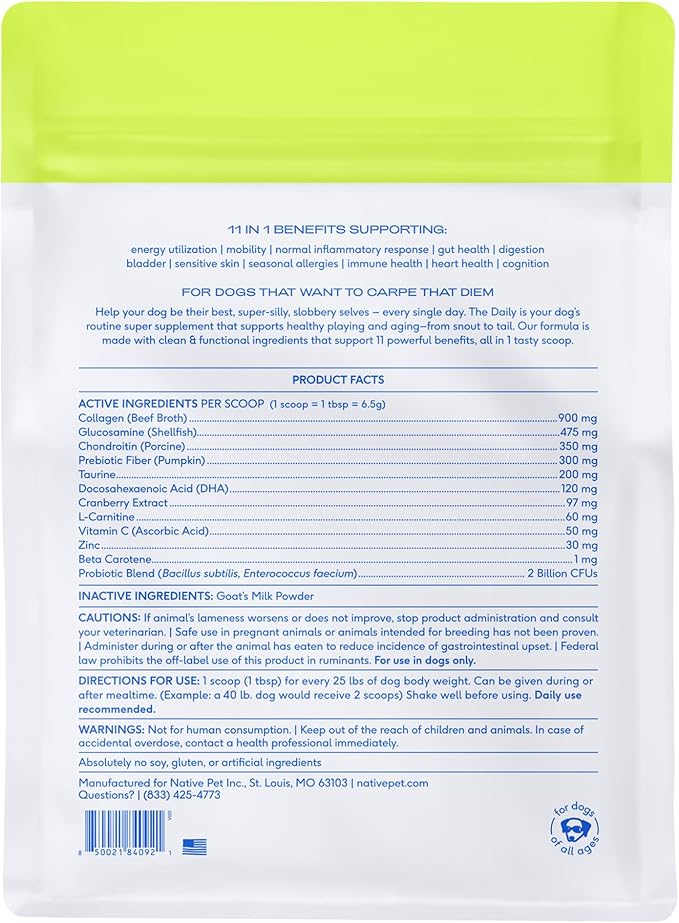 - Convenient And Effective: Native Pet's The Daily Dog Supplement Multivitamin is an unflavored 120-scoop dog powder that's easy to use. Just add to dog food for a boost of active pet vitamins. With a 1-year guarantee, it's a trusted choice for heart health and daily essentials