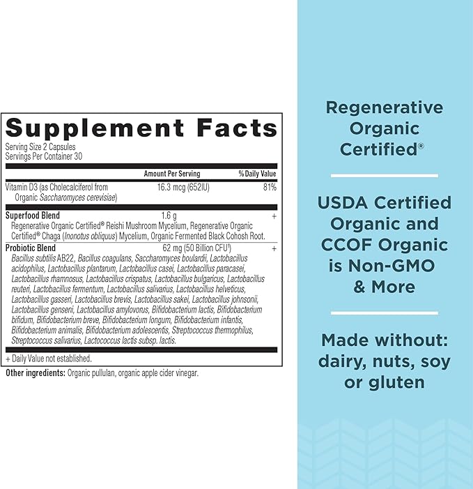 - This formula combines soil-based organisms with lactic acid bacteria for our most diverse formula yet. It also includes proprietary strain Bacillus subtilis AB22, which is a highly effective, live culture strain. Designed to survive and thrive in your gut, this first ever Regenerative Organic Certified Menopause Support Probiotics provides 25B CFUs1 in every serving.