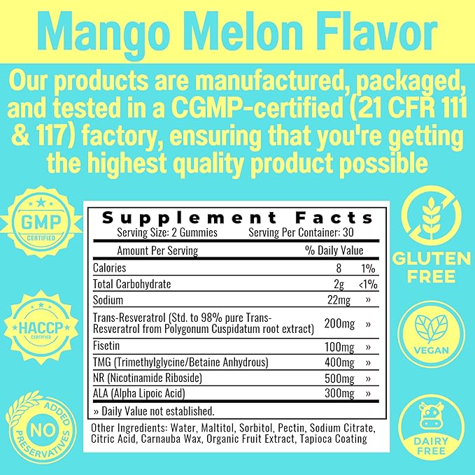 1500mg NAD+ Sugar Free Gummies | NAD + Plus NR TMG ALA Trans-Resveratrol Fisetin Supplements | Nicotinamide Riboside Trimethylglycine Alpha Lipoic Acid Betaine Pills Capsules Tincture Supplement Alt