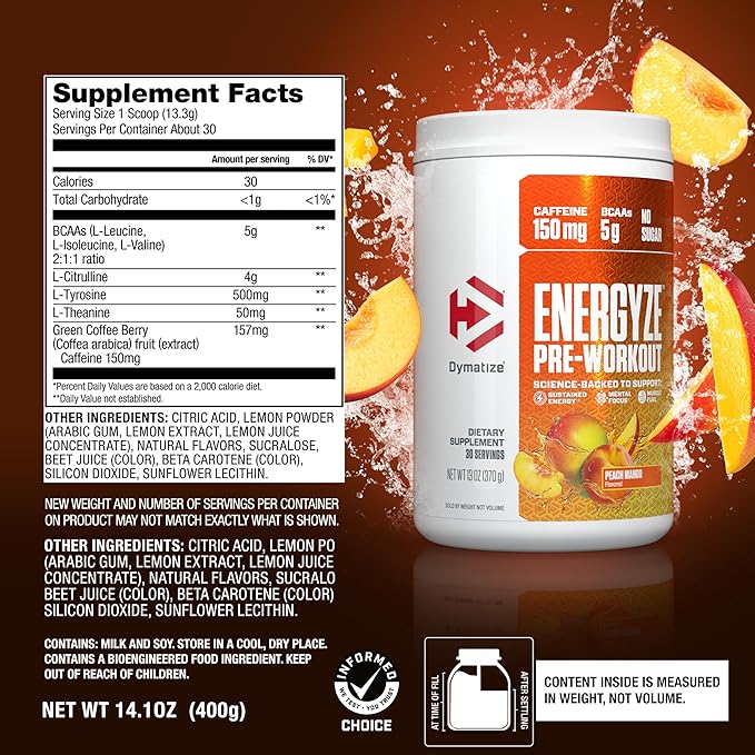 Dymatize Energyze Pre Workout Powder for Men and Women, Peach Mango Flavor, 150mg Caffeine, 5g BCAAs, Performance Blend of L-Theanine, L-Tyrosine, L-Citrulline, No Sugar, 30 Servings