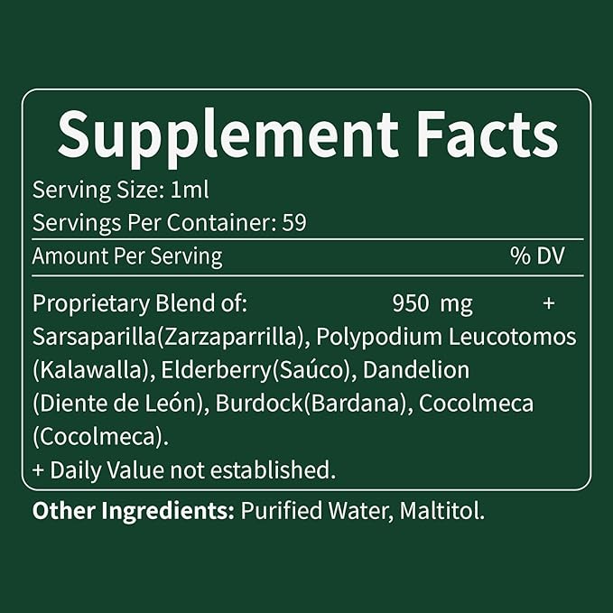 - ♜ DETOX & CLEANSE: Our Sarsaparilla supplement helps lighten the body's detox load. Mexican Sarsaparilla is used for liver cleansing, detox, and repair. It supports liver function and promotes overall liver health. Combined with the natural diuretic Dandelion, it helps reduce edema and aids in liver cell repair. At the same time, our tincture also contains Burdock and Cocolmeca. They stimulate bowel movements and promote regularity, enhancing the body's overall detox process.*