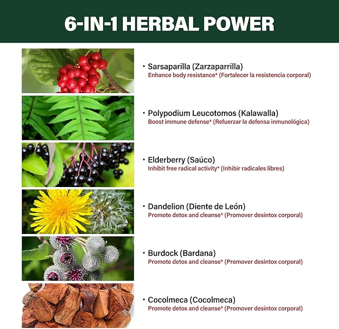 - ♜ SYNERGISTIC EFFECT: Our 6 in 1 Sarsaparilla liquid supplement supports overall health through synergy. Mexican Sarsaparilla detoxifies the body and promotes liver health, while Dandelion, Burdock, and Cocolmeca reduce detox load. Combined with Elderberry and Kalawalla, it boosts immunity and protects cells. This alcohol-free tincture offers full-spectrum health support and enhances vitality.*