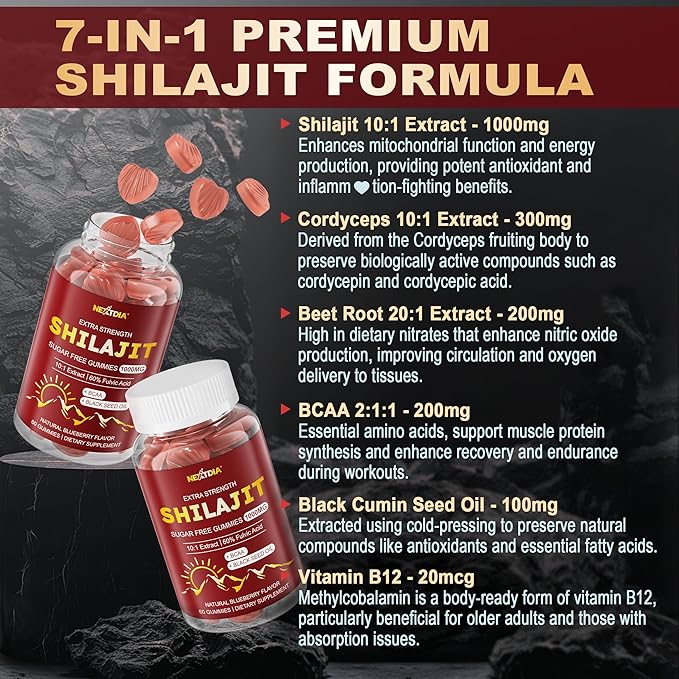 - SUGAR-FREE SHILAJIT GUMMY - Savor the delightful blueberry flavor of NEXTDIA's Shilajit complex gummies, guilty less with a natural sweetener, monk fruit extract (Zero Calories & Carbs). Free of soy, gluten, dairy, and artificial additives, they offer an ideal alternative to traditional Shilajit resin or pills. They are encapsulated, bottled & tested in cGMP-compliant facilities with USA and imported ingredients, to ensure superior quality & consistency.