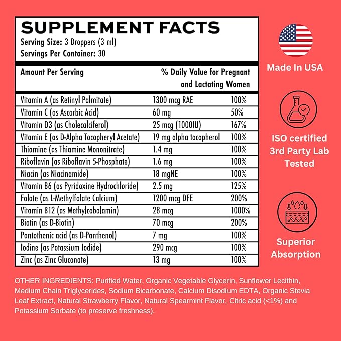 - Easy to Use and Tasty: Our Liposomal Prenatal + Postnatal- Iron Free Liquid Multivitamin comes in easy-to-take liquid drops. Just mix 3ml (3droppers) in 8 ounces of cold water or your favorite beverage and drink. Plus, the Natural Strawberry-Mint flavor ensure a pleasant experience every time.